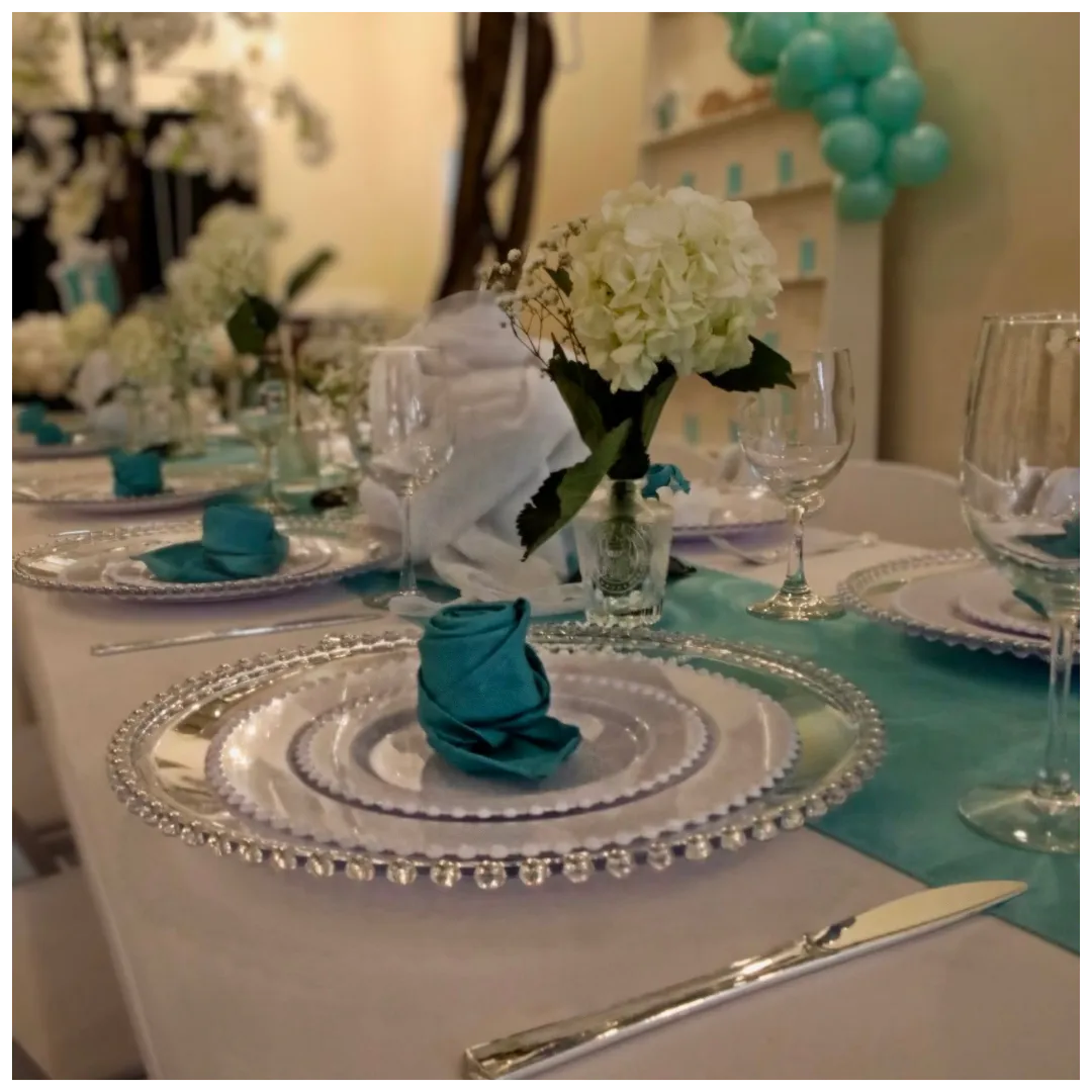 Elegant Tablescape: Premium linen with matching napkins, floral centerpieces, and chargers