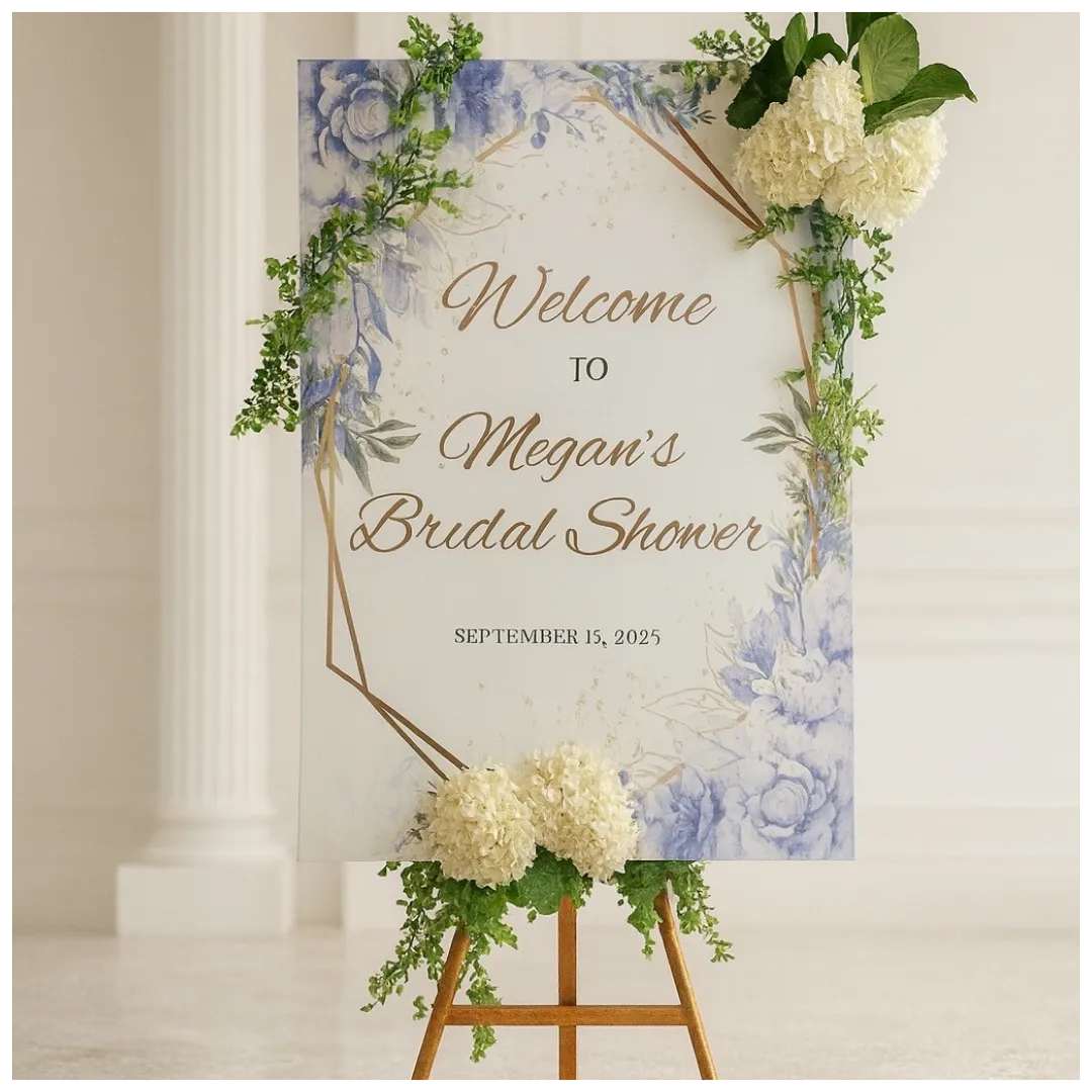 Backdrop: Custom luxury backdrop with floral wall or shimmer panels and acrylic signage